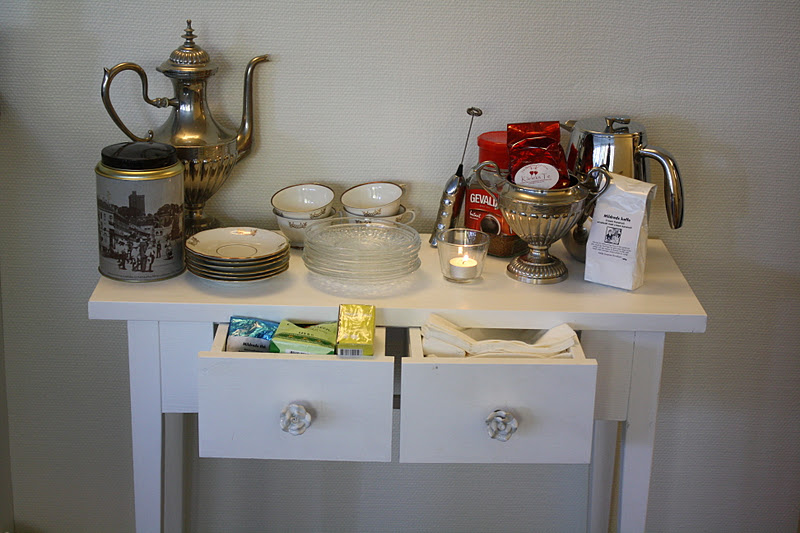 Det är bara att gå och ta sig kaffe eller thé om man önskar. Det står alltid uppdukat.